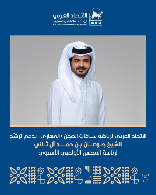 يُعلن الاتحاد العربي لرياضة سباقات الهجن (المهاري) – رئيسًا وأعضاء في لجنته التنفيذية – دعمه الكامل لترشّح سعادة الشيخ جوعان بن حمد آل ثاني لرئاسة المجلس الأولمبي الآسيوي، انطلاقًا من إيماننا بقدرته على قيادة مرحلة جديدة من العمل الرياضي القاري، تجمع بين الرؤية الحديثة والوفاء للهوية الآسيوية المتنوعة.